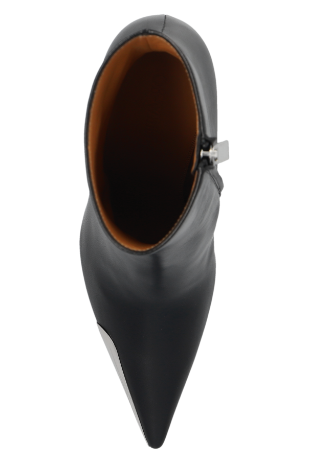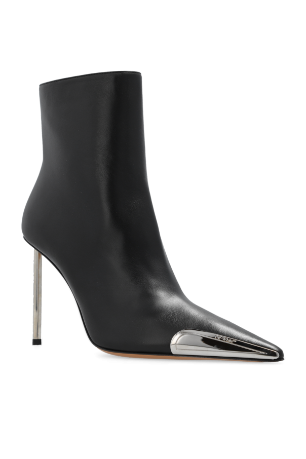 Black ‘Allen’ heeled ankle boots from Off-White. Made of leather, this pair features a side zip, pointed toe with a metal detail, the brand’s signature Allen Key heel engraved with a logo in silver-tone and a beige leather sole.