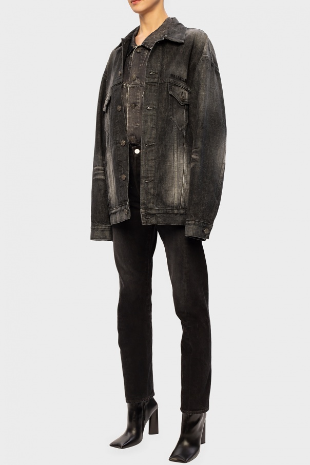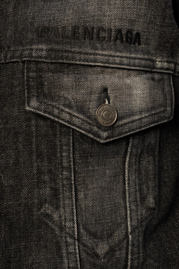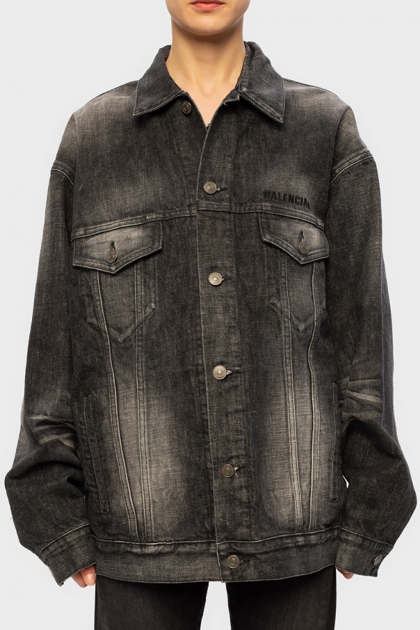 Dark grey denim jacket from Balenciaga. This jacket design is cut to an oversize silhouette with button fastening, long sleeves with cuffs, two slip pockets on the sides and two buttoned flap pockets on the chest.