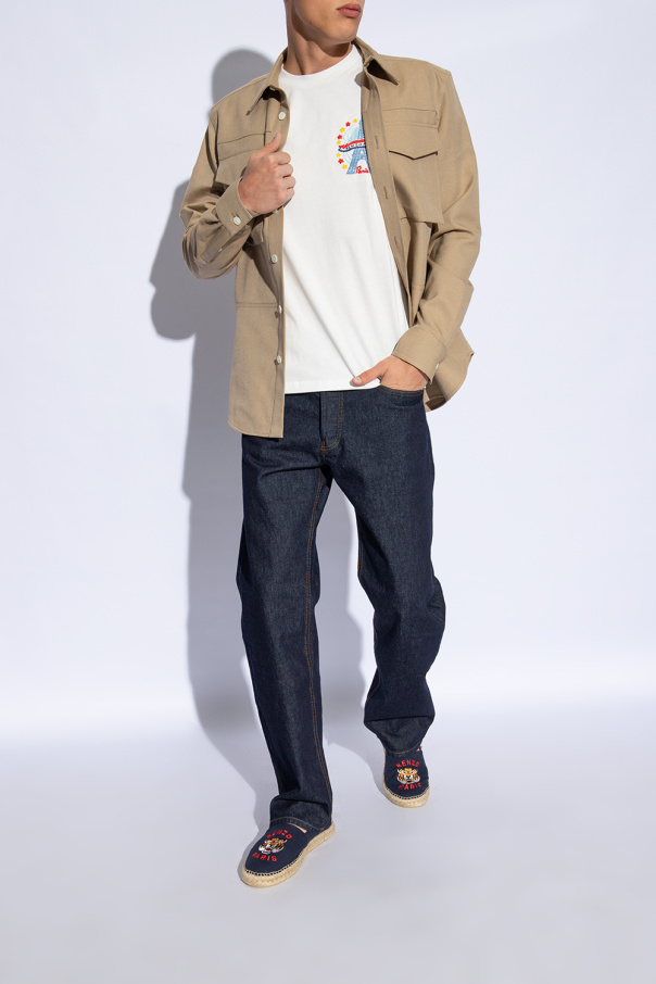 Navy blue espadrilles from Kenzo. Made of fabric, this model sits on a beige rubber sole and showcases graphic embroidery with a motif of animals and the brand\'s logo.