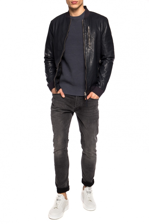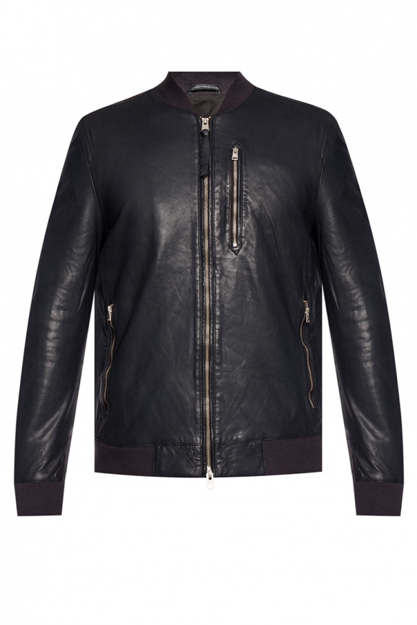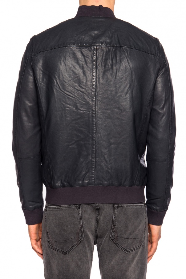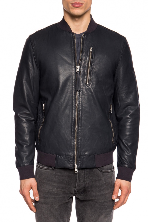 Navy blue ‘Kino’ leather bomber jacket from AllSaints. Two-way zip closure. Three zip pockets on front. Elasticized hem and cuffs.