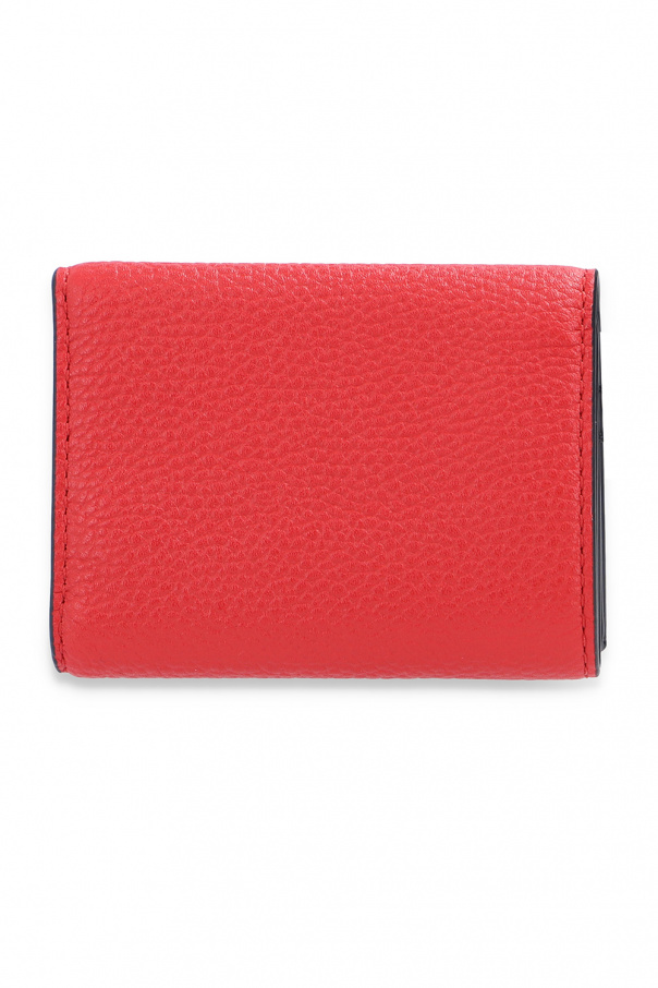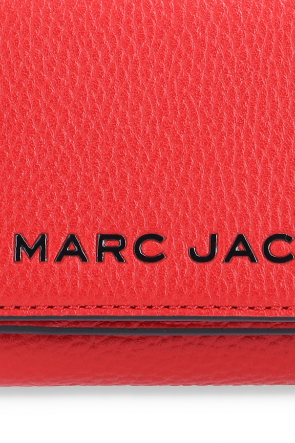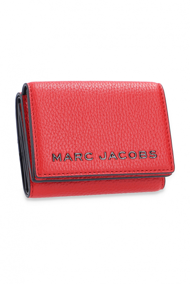 Red wallet from Marc Jacobs. Made of leather, this design fastens with snaps and is enriched by an embossed logo pattern in black and silver-tone metal hardware. It has one coin pocket, six card slots, two slip pockets and one bill compartment inside.
