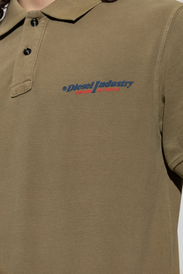 Green ‘T-SMITH-IND’ polo shirt from Diesel. Crafted from cotton, this style features a collar with a button placket, a navy blue and red logo printed on the front, and short sleeves with elasticated cuffs.