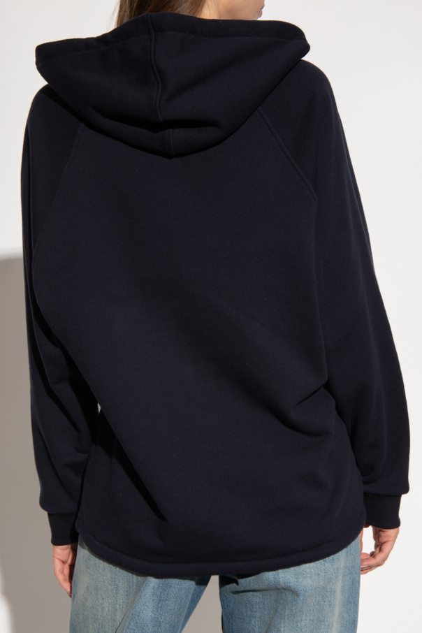 Navy hoodie from Gucci. Made of cotton, this oversize garment features a gold-tone zip, the label’s signature green and red Web stripe, drawstring hood and hem, front pocket and long raglan sleeves with ribbed cuffs.