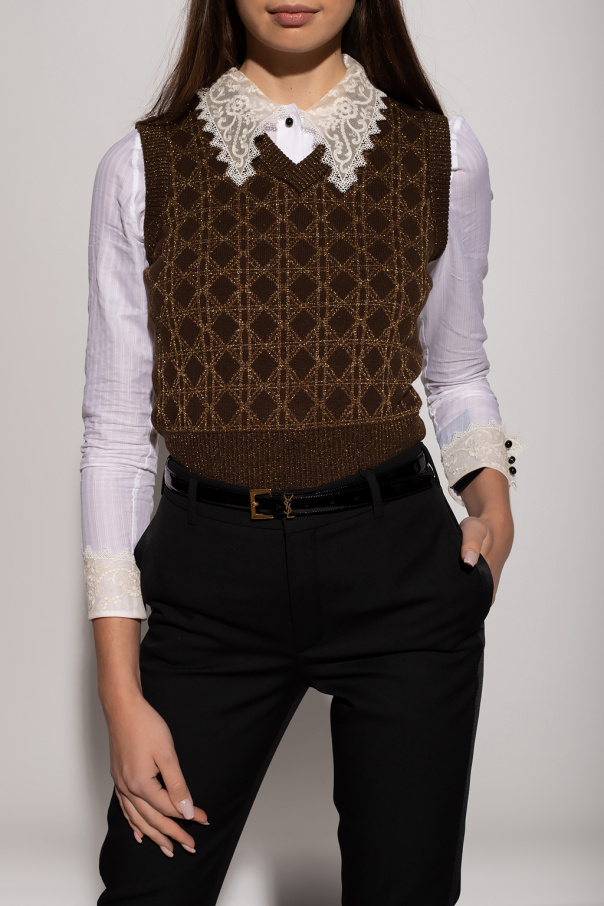 Dark brown vest from Saint Laurent. Crafted from wool, this style features a V-neckline and gold-tone lurex trims throughout.