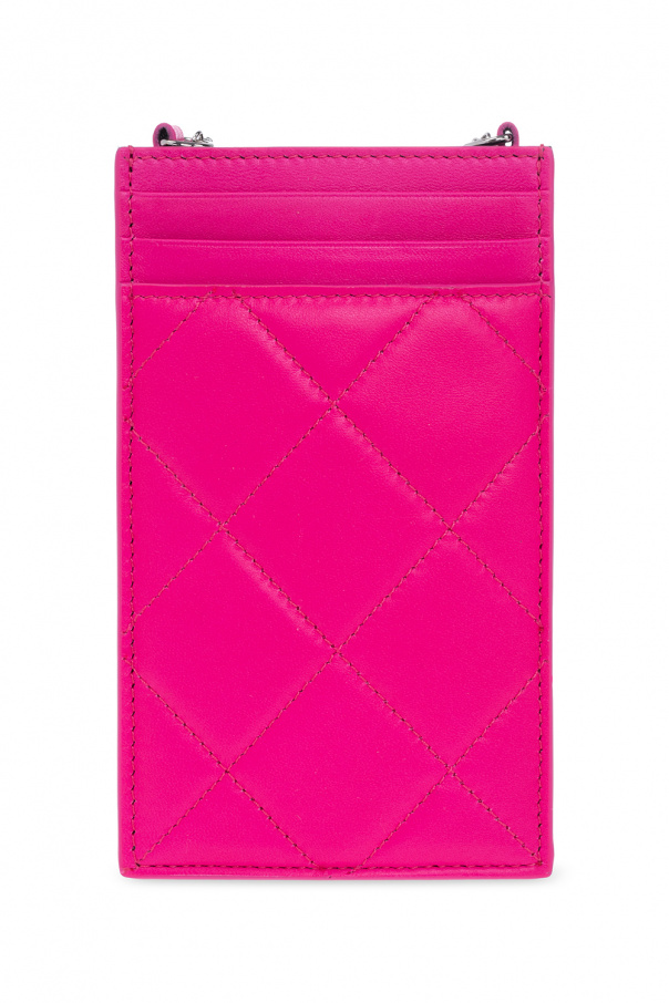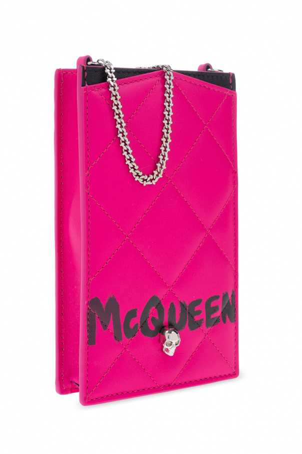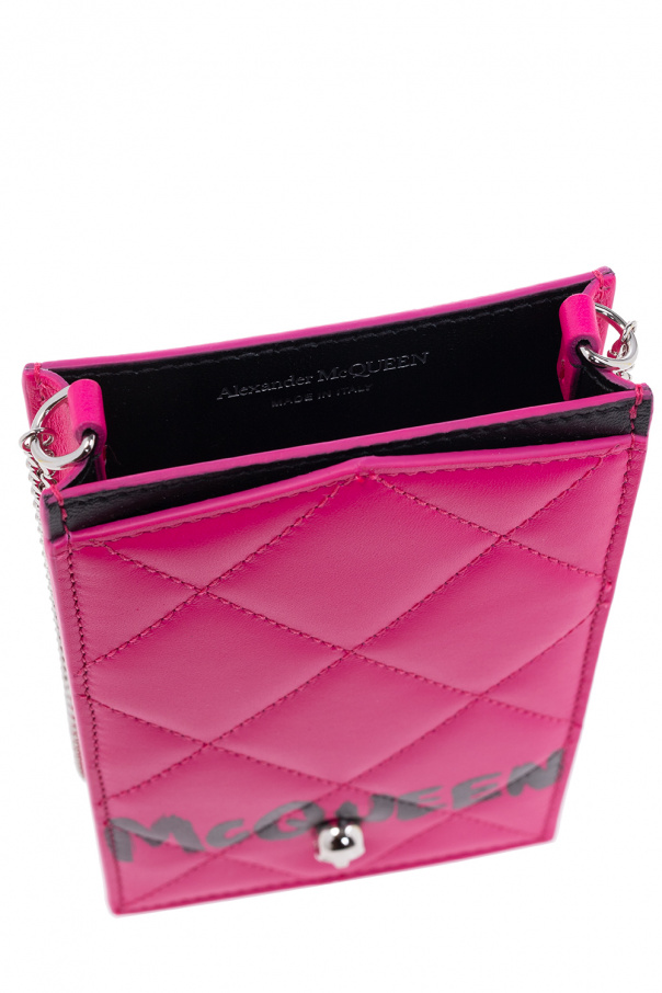 Pink and black quilted phone holder with a chain from Alexander McQueen. Made of lamb leather, this model features the label’s signature skull motif, shoulder chain, silver-tone metal hardware, slip pocket, four card slots and one internal compartment.