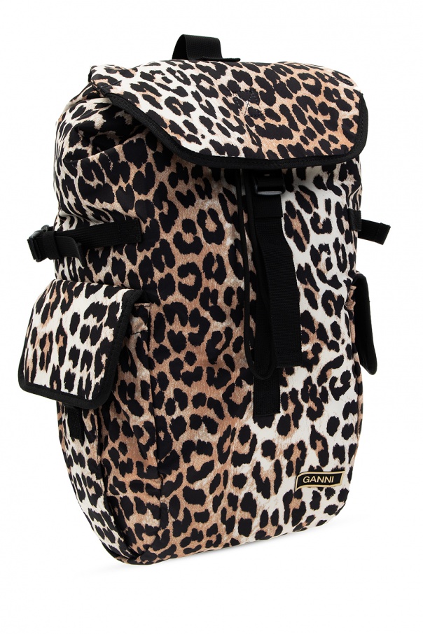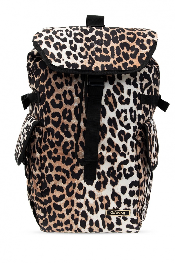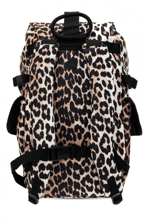 Beige, brown and black backpack from Ganni. Fastened with drawstrings, this design features an animal pattern, drawstring and buckle fastenings, two flap pockets, half-round handle, adjustable shoulder straps, waist strap, black metal hardware and one internal compartment with one slip pocket.
