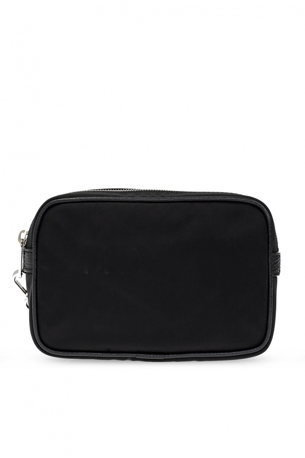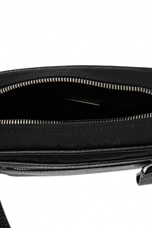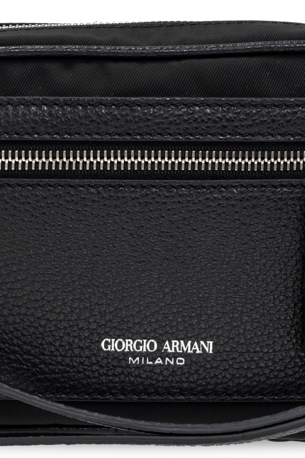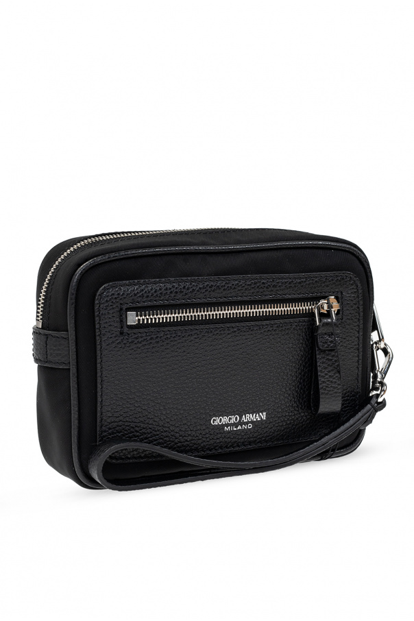 Black hand bag from Giorgio Armani. Fastened with a zip, this design features an embossed logo pattern in silver-tone, front zip pocket, wrist strap, leather trims and one internal compartment with one slip pocket, four card slots and a strap with a keyring.