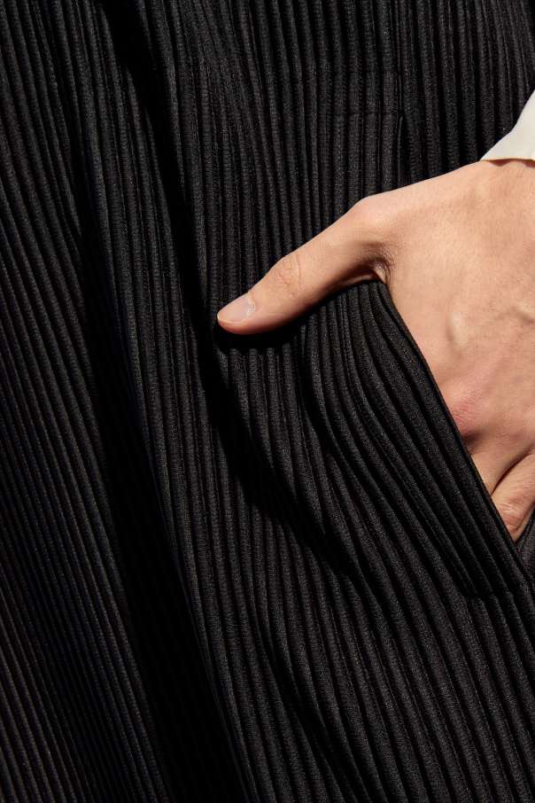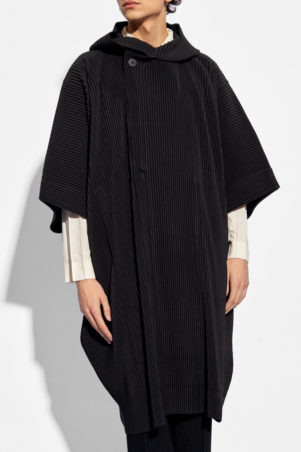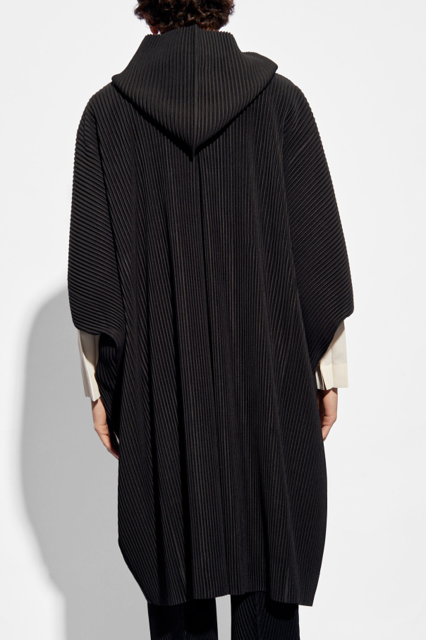 Black pleated hooded coat with two slip pockets and short sleeves from Issey Miyake Homme Plisse.