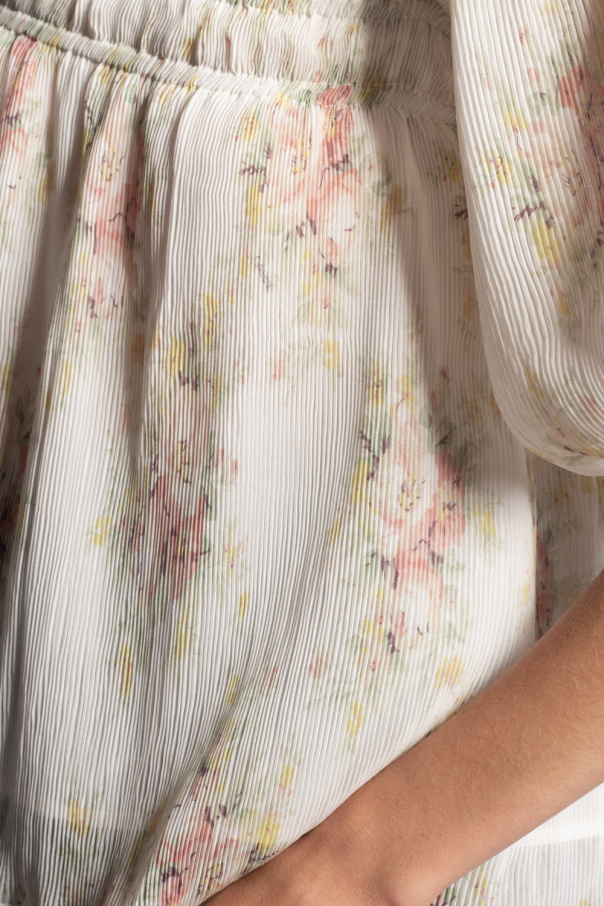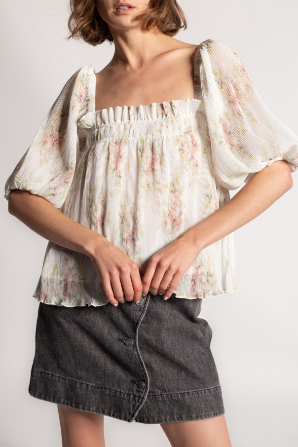 Cream pleated top from Ganni. This long sleeve design is enriched by a floral print and ribbed cuffs.
