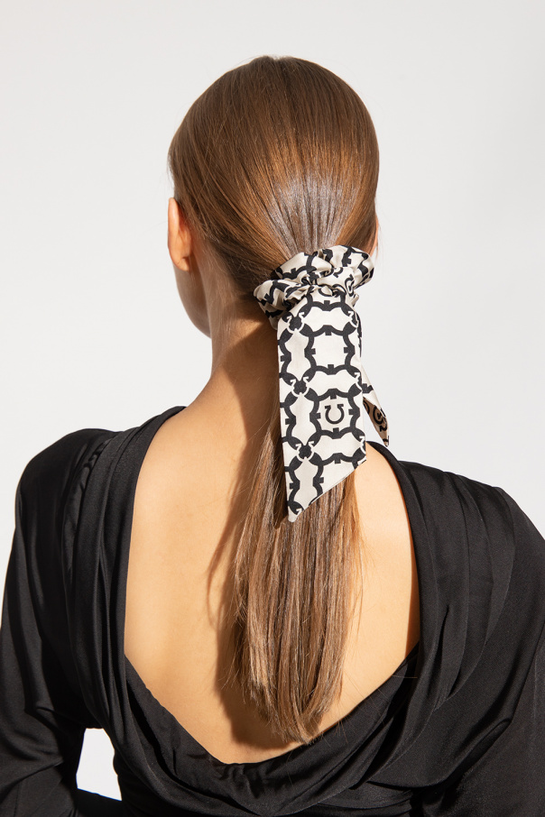 Cream scrunchie from Salvatore Ferragamo. Made of silk, this item showcases a black Gancini pattern.