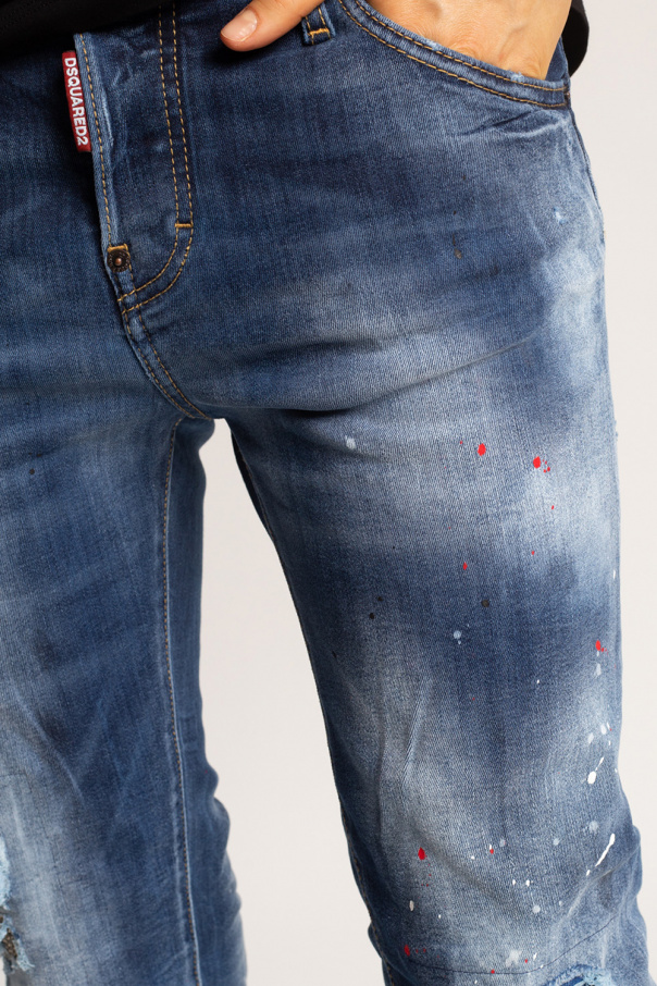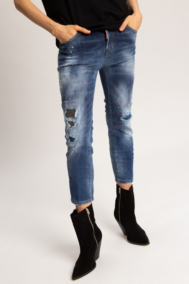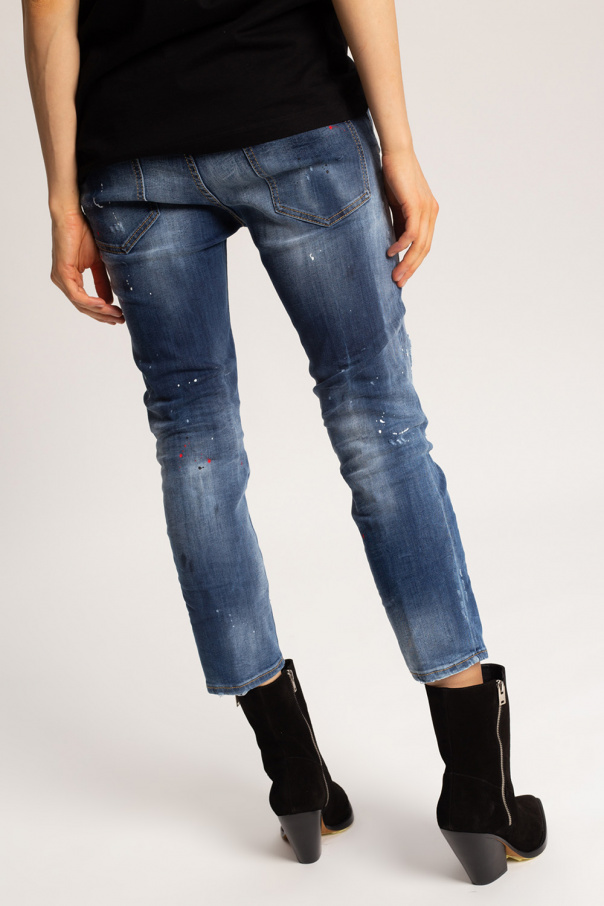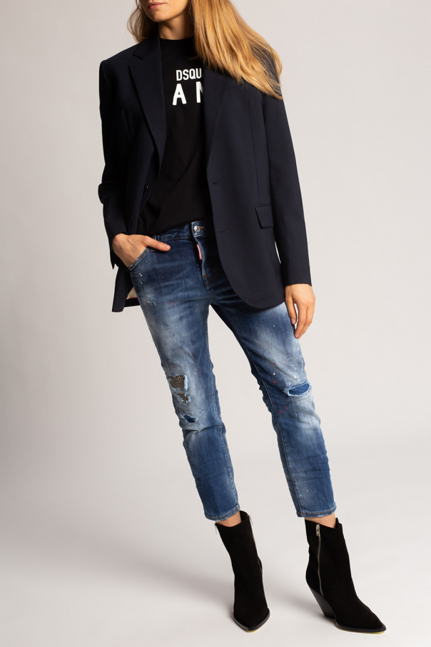 Navy \'Cool Girl Cropped\' jeans from Dsquared2. Embellished with a decorative appliqué, yellow stitching details and white and red paint splatter effects, this pair falls down with tapered legs and features button fastenings, classic five pockets, frayed edges and a black leather patch with an embossed logo at the back.