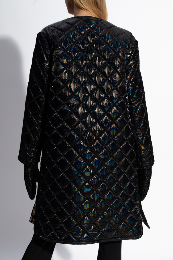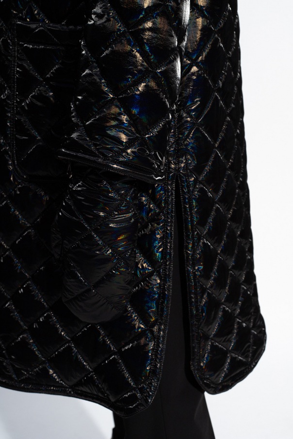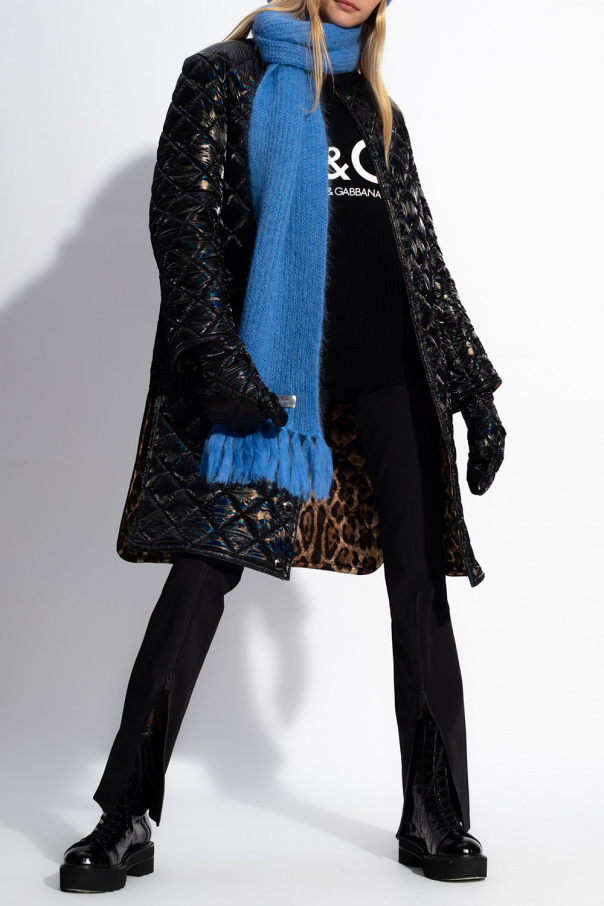 Black quilted raincoat with gloves from Dolce & Gabbana. Fastened with snaps, this garment features a holographic motif, two slip pockets, side slits, silver-tone metal hardware and lining printed with an animal motif in brown and black.