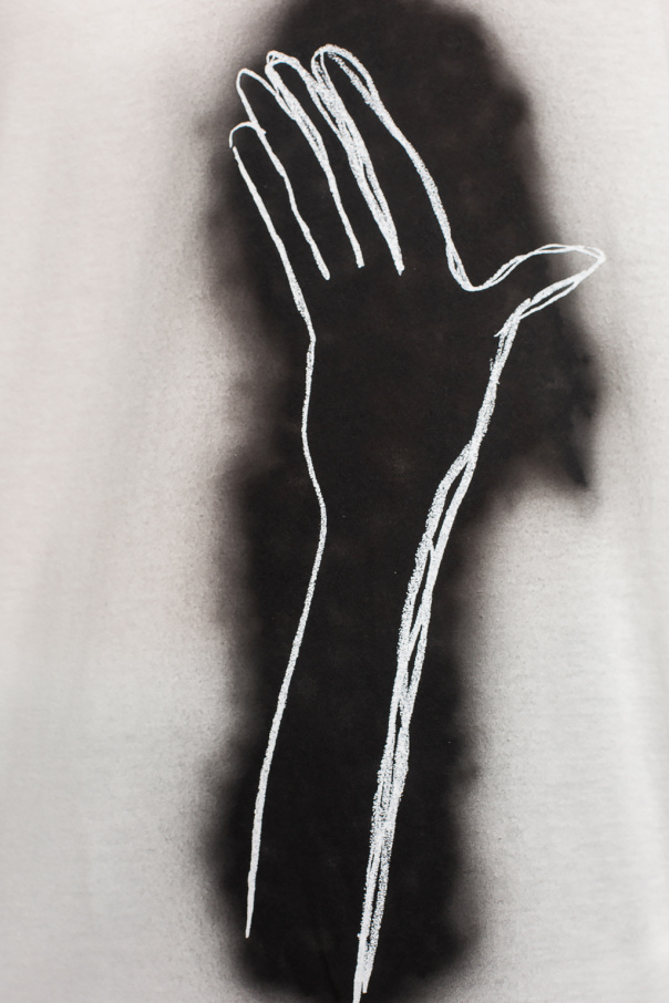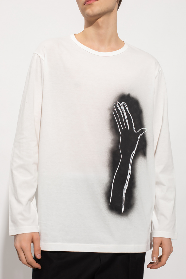 White crewneck T-shirt from Yohji Yamamoto. Made of cotton, this style features long sleeves, an elasticated collar and a black and white graphic print.