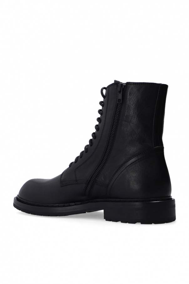 Black ‘Santiago’ ankle boots from Ann Demeulemeester. Crafted from leather, this lace-up design features a side zip and a black rubber sole.