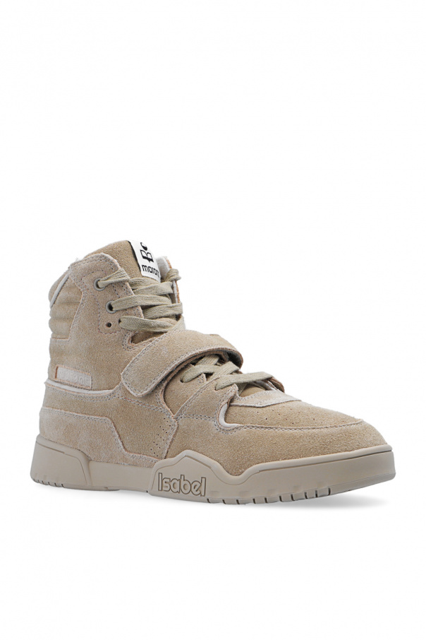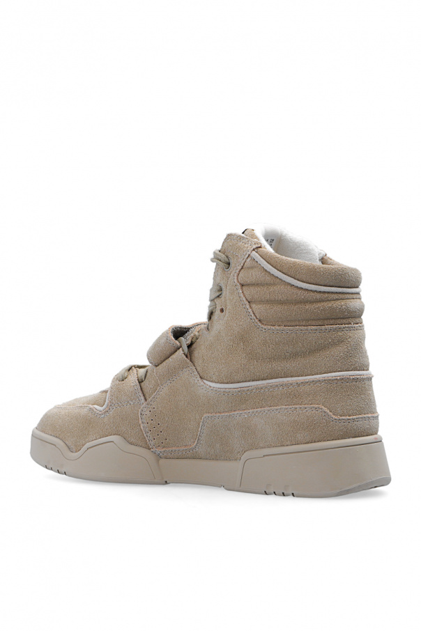 Beige ‘Alsee’ sneakers from Isabel Marant. Crafted from lamb suede with a high-top silhouette, this lace-up model features velcro fastenings, a cream and black logo patch, decorative perforations on the front and side, and a beige rubber sole.