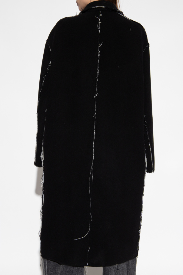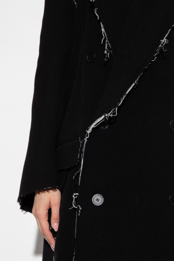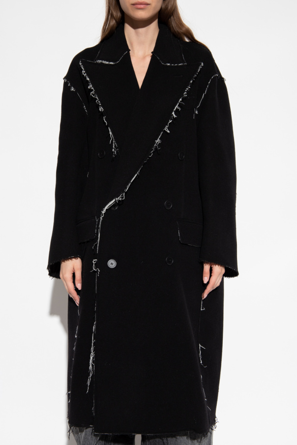 Black double-breasted coat from Balenciaga. Made from a wool blend with an oversize silhouette, this style features button fastenings, one welt pocket, two flapped pockets, long sleeves, a single back vent and raw edges.