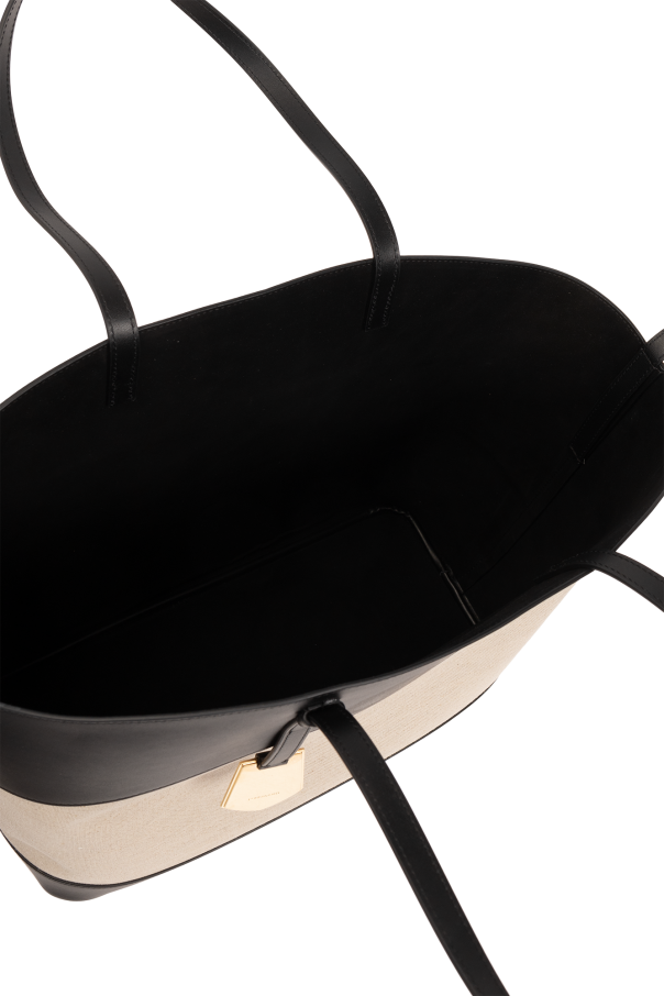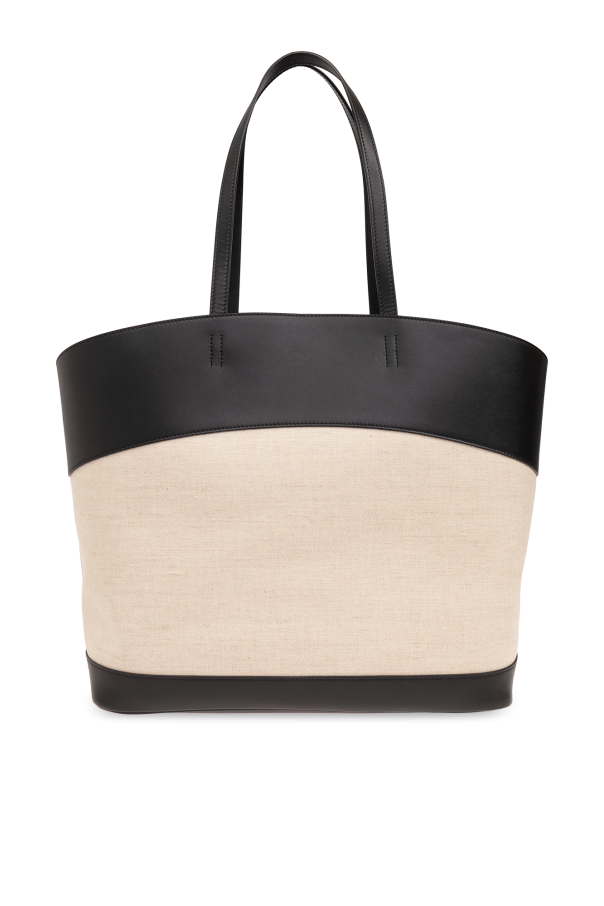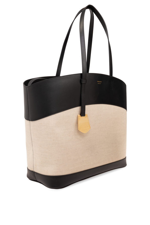Black and cream shopper bag from FERRAGAMO. Made from a mix of linen, cotton and leather, this design showcases a logo print, two half-round handles, gold-tone metal hardware and one internal compartment with a strapped zip pouch.