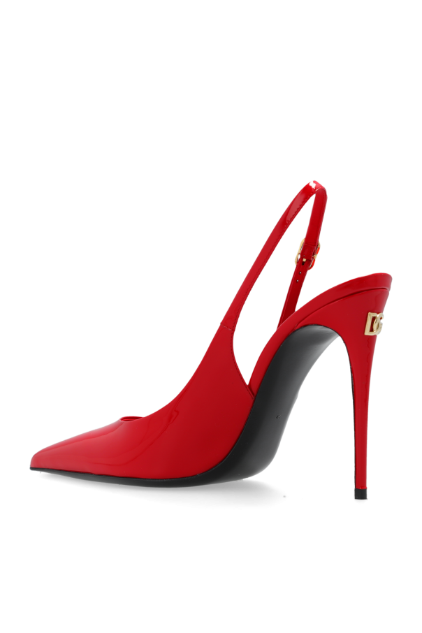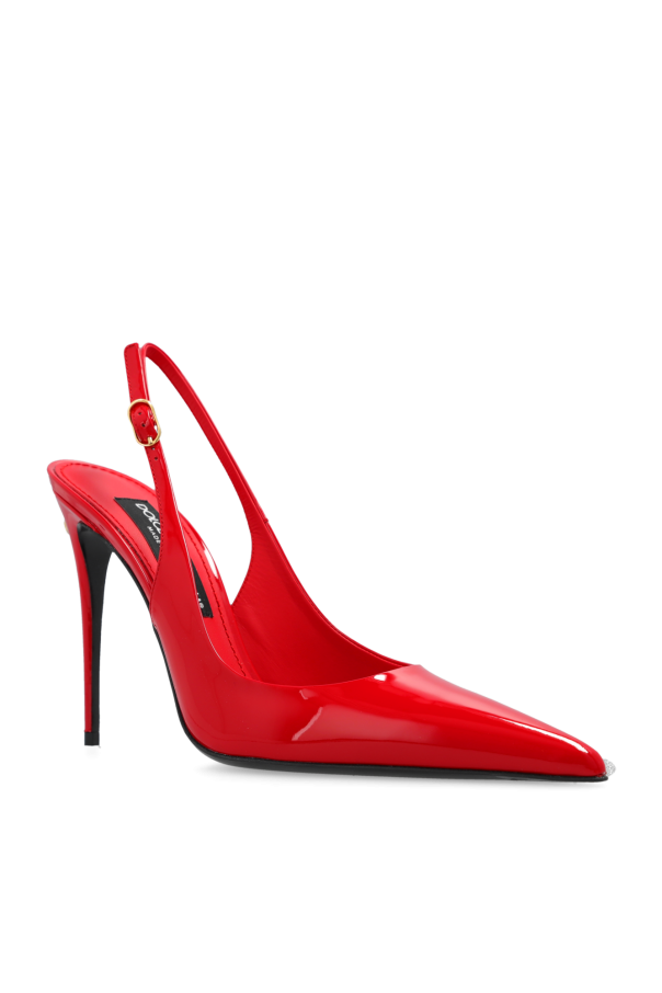 Red ‘Lollo’ pumps from Dolce & Gabbana. Made of patent leather, this pair features an adjustable buckle strap, pointed toe and black leather sole.