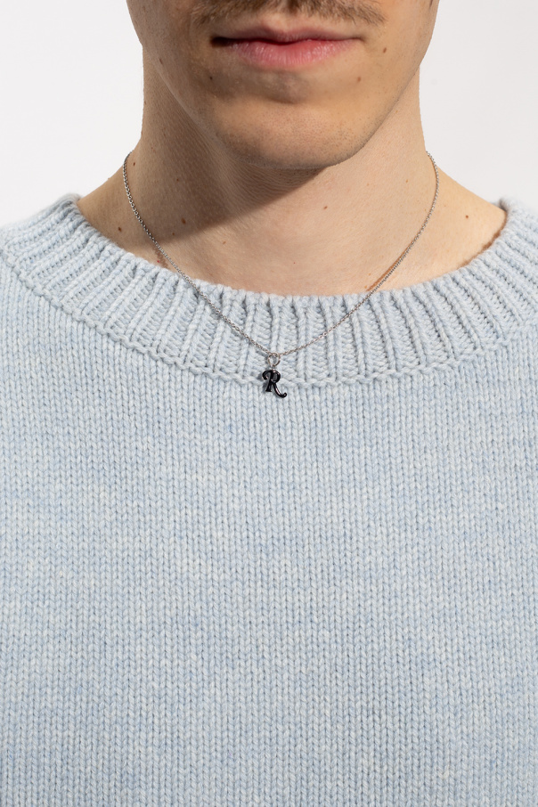 Silver-tone necklace from Raf Simons. Made of brass, this item features a black logo charm and snap hook.