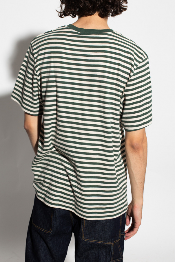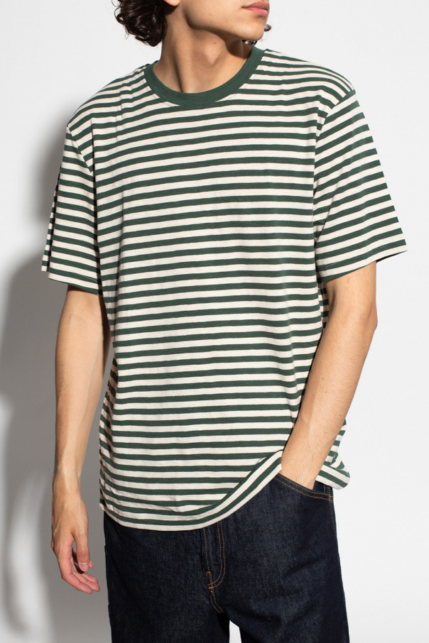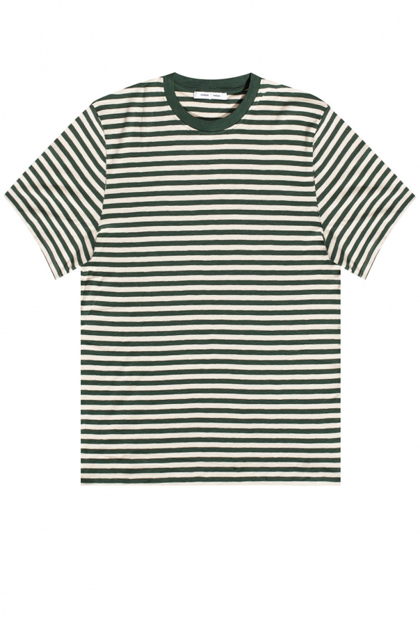 Beige and green crewneck T-shirt from Samsoe Samsoe. Crafted from organic, recycled cotton with the international Global Organic Textile Standard (GOTS) certificate, this style features an all-over stripe pattern. GOTS means that the product was created with the environment and social responsibility in mind. At any stage of the production chain, no hazardous or harmful substances were used, employees received decent salary for their work, water consumption was minimized by 91% and CO2 emissions were reduced by 46%.