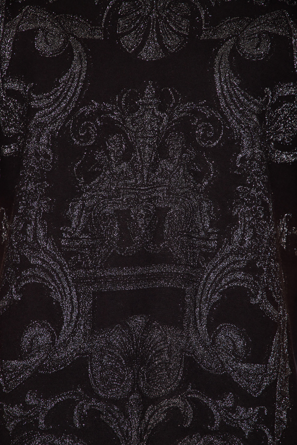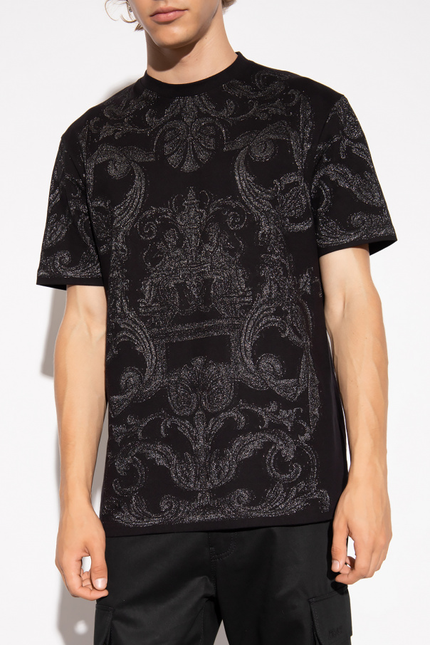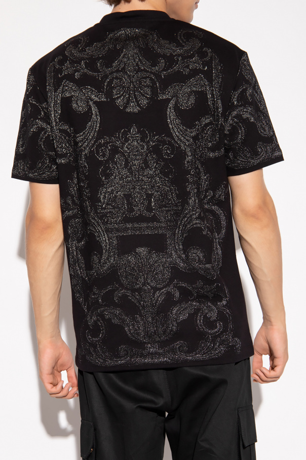 Black crewneck T-shirt from Versace. Crafted from a cotton blend with a relaxed fit, this style features short sleeves, an elasticated collar and a silver-tone ‘Silver Baroque’ pattern embroidered with glossy yarns.
