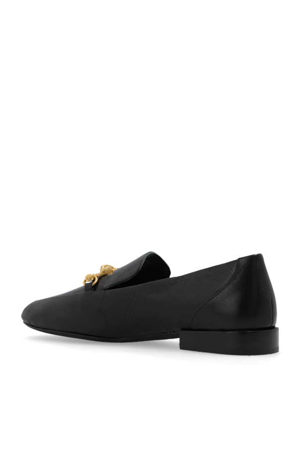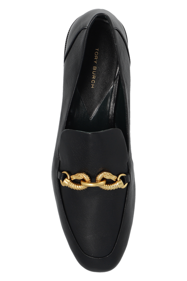 Black ‘Jessa’ loafers from Tory Burch. Made from goat leather, this model sits on a black sole in leather and rubber and features gold-tone horse head hardware on the front.