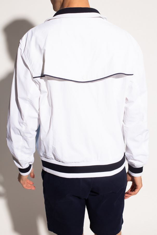 White, blue and navy jacket from Coach. Made of recycled fabric, this garment fastens with a two-way zip and is complete with a blue, green and navy logo patch, two snap-fastened pockets and striped ribbed trims at the collar, hem and cuffs.