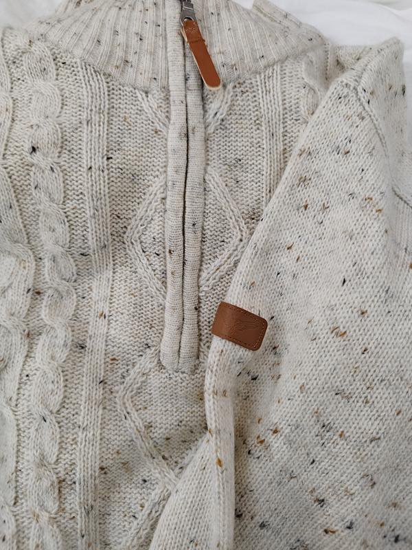 красивый, стильный свитер вязаный мягкий и теплый! Утолщенный воротник-стойка с застежкой-молнией обеспечивает удобную посадку, а манжеты и низ отделаны слегка эластичной резинкой . Свитер сочетает в себе ткань джерси с красивым узором в виде кос спереди. Этикетка на рукаве. 75% акрил, 25% шерсть для легкого ухода. Длина по спинке см для размера хххl. пог 64 см , плечи 49 см , рукав 68 см , длина по середине спинки 71 см без учёта воротника , низ ширина резинка 57 см . В отличном состоянии