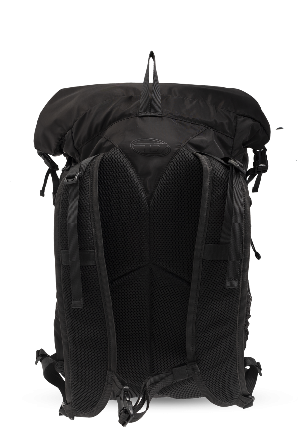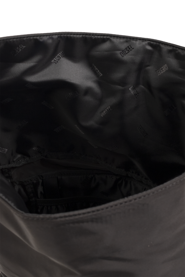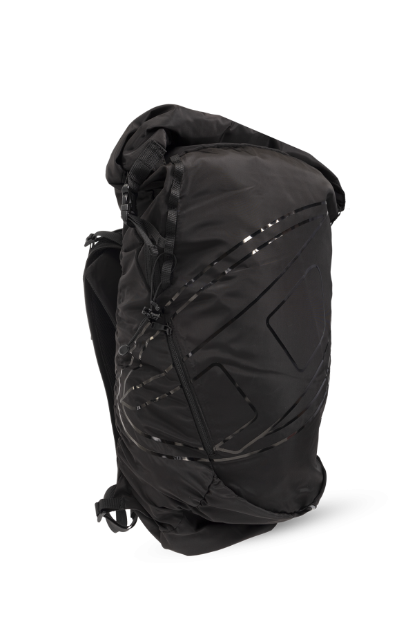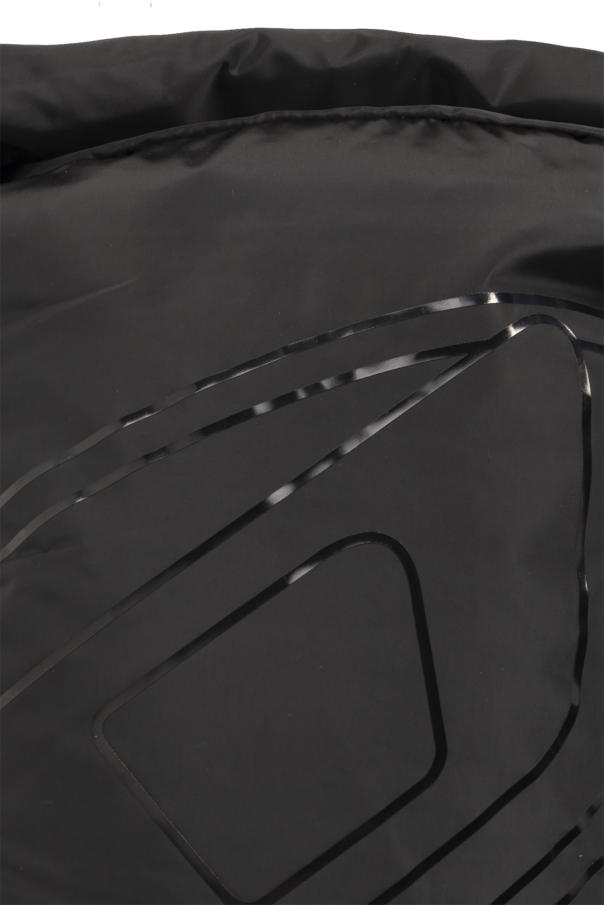 Black ‘DRAPE’ backpack from Diesel. Embellished with a logo print, this design features a zip fastening, a top snap closure, slip pockets on the sides, black metal hardware and one internal compartment with a slip pocket.