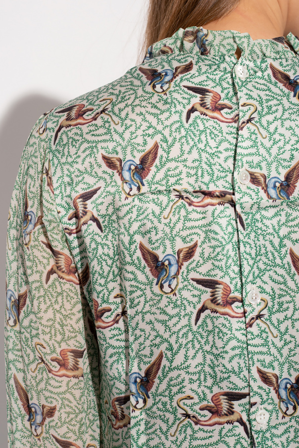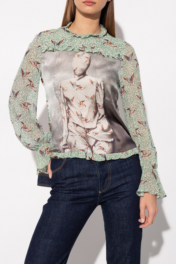 Multicolored top from Undercover. Crafted from silk, this garment fastens with buttons at the back and is enriched by ruffles as well as animal and floral motifs.
