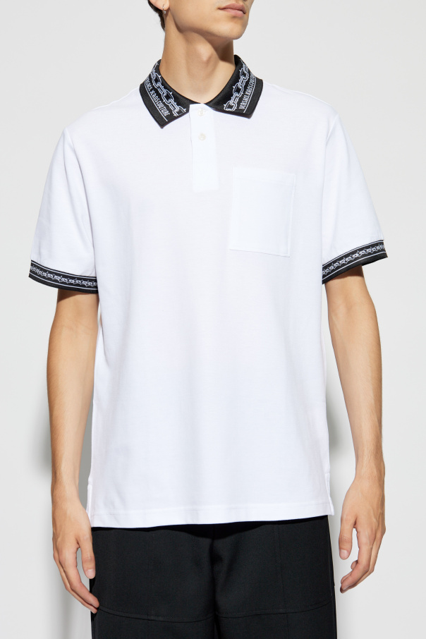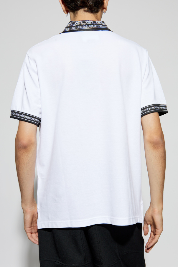 Introducing the exclusive Polo with Logo by the illustrious Versace Jeans Couture. This pristine white polo shirt epitomizes the pinnacle of luxury and sophistication. Meticulously crafted from premium quality cotton, this polo ensures unparalleled comfort and durability. The striking black and white chain-patterned collar and sleeve cuffs, adorned with the iconic \"VERSACE JEANS COUTURE\" inscription, add an exquisite touch of elegance and brand distinction. The polo features a classic button-down closure beneath the collar, aligning with the timeless polo style. A neatly placed chest pocket on the left adds a subtle yet practical element to the design. This piece seamlessly blends a classic aesthetic with contemporary flair, making it a versatile addition to any wardrobe, perfect for both casual and formal occasions. Why Choose This Product? Premium Material: Made from 100% high-quality cotton for exceptional comfort and longevity. Iconic Design: The distinctive chain-patterned collar and cuffs with the Versace Jeans Couture branding. Versatile Style: Suitable for a variety of occasions, from casual to formal. Attention to Detail: Features a classic button-down closure and a practical chest pocket. Exclusivity: Designed by the legendary Versace brand, known for its innovative and luxurious fashion.