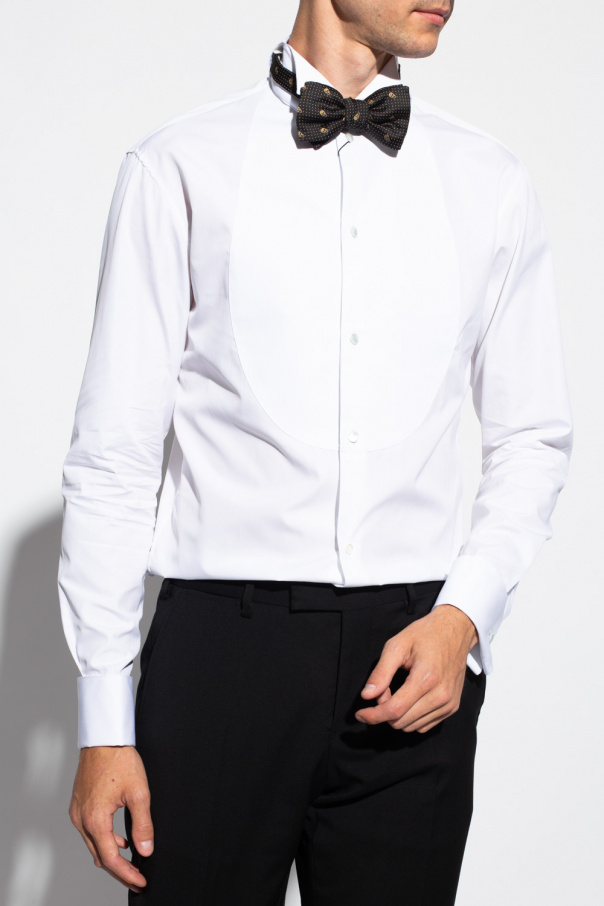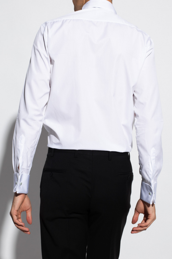 White tuxedo shirt from Emporio Armani. Crafted from cotton, this style fastens via buttons and showcases a ribbed tonal bib panelling on the front and cuff link-suitable cuffs.