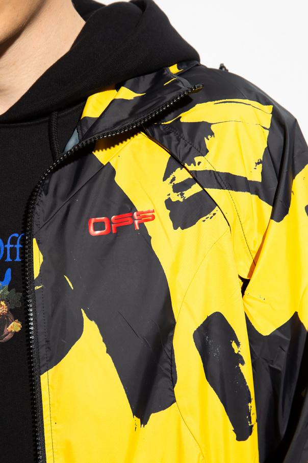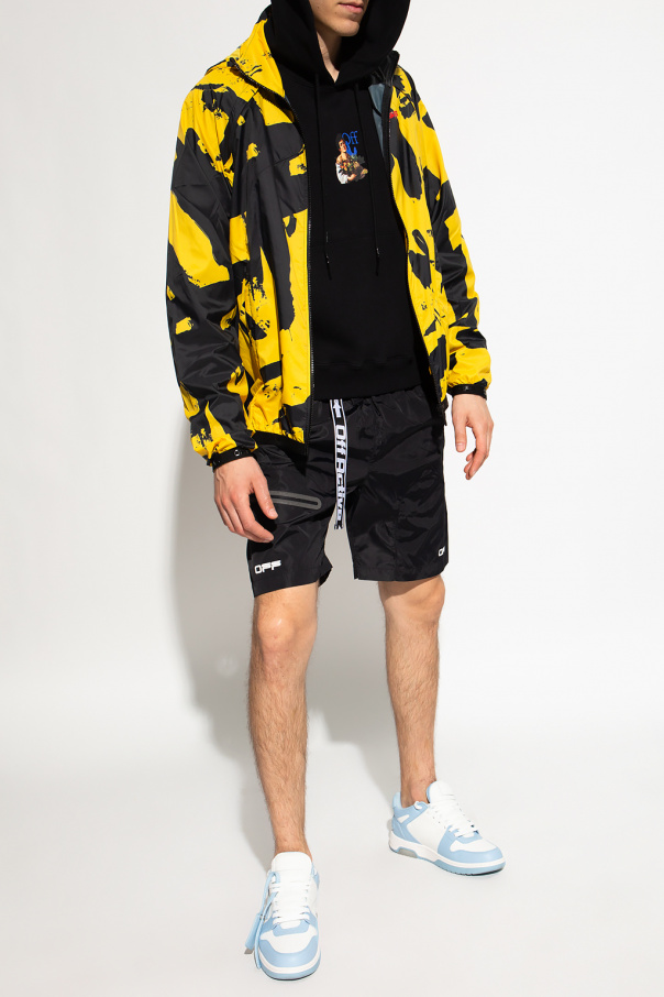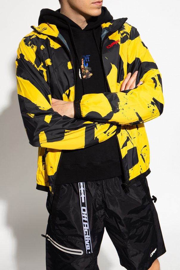 Black and yellow jacket from Off-White, the ‘Active’ line. Fastened with a zip, this garment features a drawstring hood, printed pattern, red logo, two zip pockets, detachable sleeves and elasticated trims.