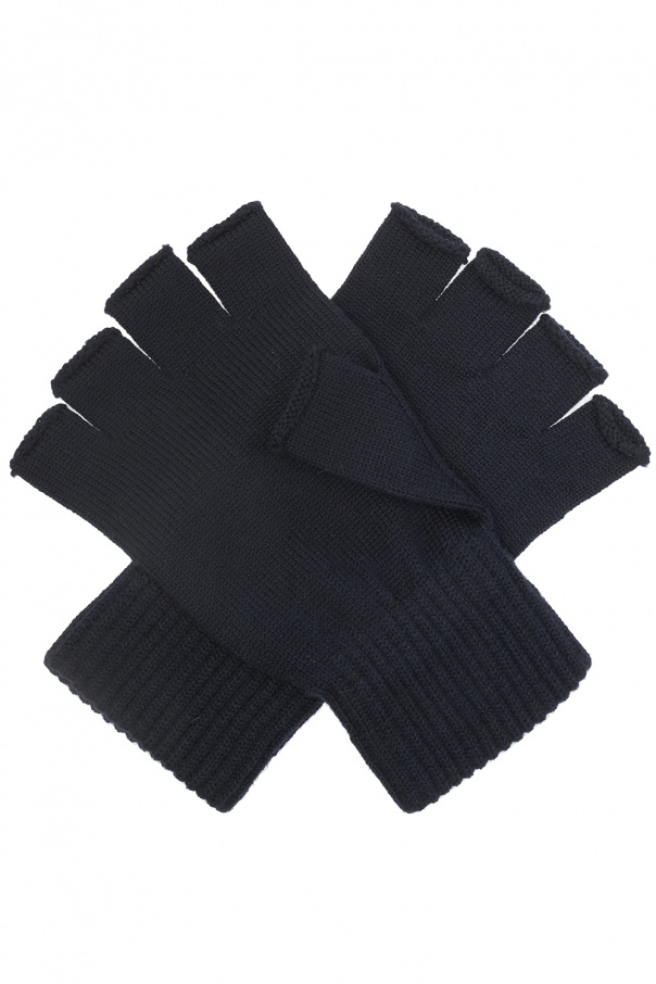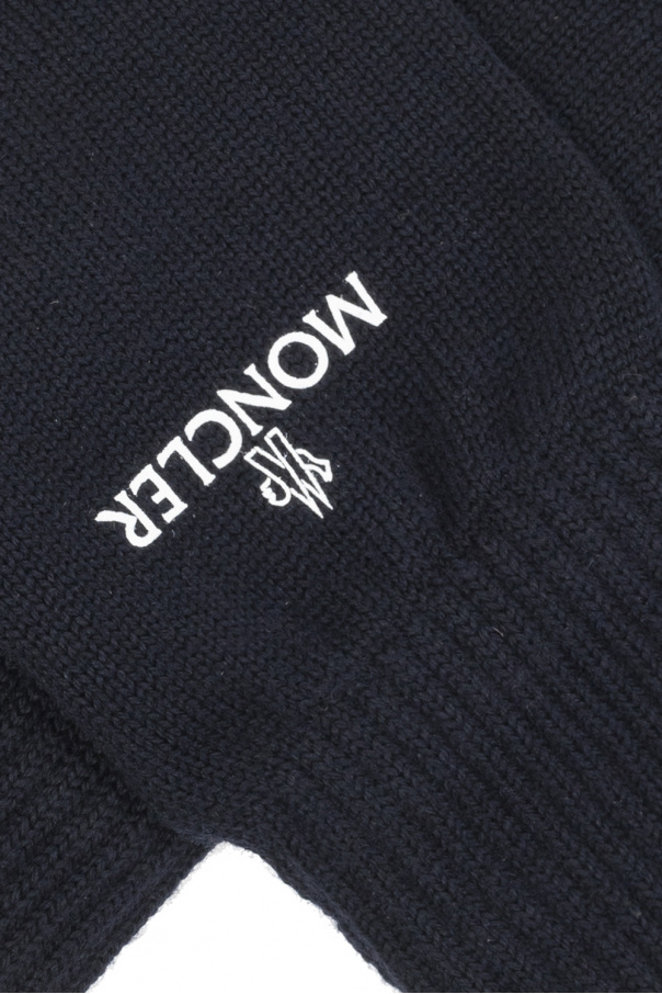 Navy fingerless gloves from Moncler. Made of wool, this pair is decorated with a white logo print.