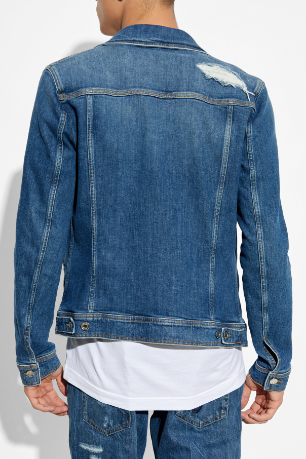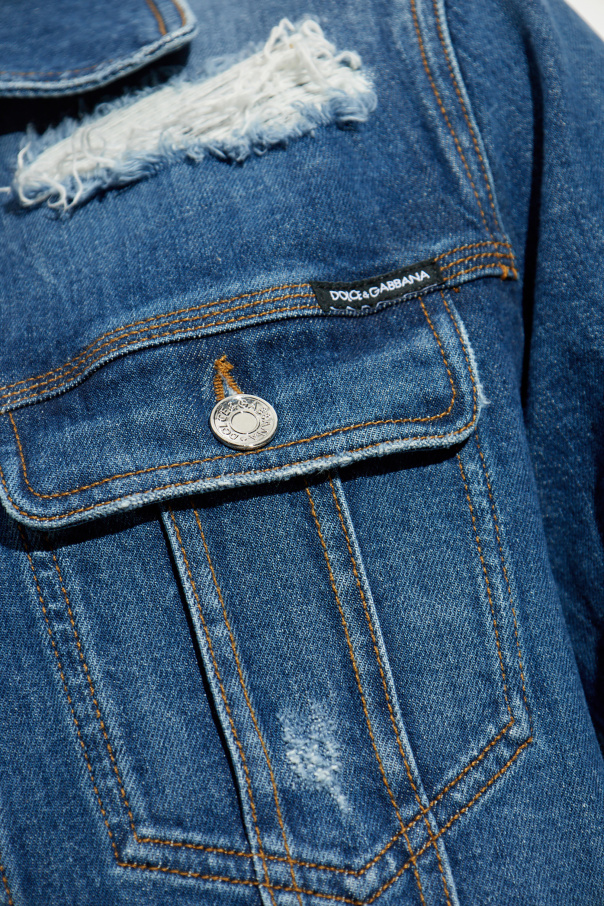 Introducing the Vintage Effect Denim Jacket from the illustrious house of Dolce & Gabbana, a timeless piece from their exclusive collection. Crafted from premium blue denim, this jacket exudes a refined yet rugged charm, epitomizing the essence of vintage style. The jacket features a classic silhouette tailored to accentuate the male form. Its distinctive vintage effect, characterized by deliberate abrasions and rips around the shoulders and pockets, adds a touch of casual elegance. Intricate brown contrast stitching enhances its classic appeal, while the metal buttons, likely adorned with the designer\'s logo, offer a subtle hint of luxury. Functional yet stylish, this jacket boasts two chest pockets with buttoned flaps, complemented by two additional side pockets. The adjustable buttoned cuffs and side waist tabs ensure a perfect fit, making this piece as practical as it is fashionable. A small designer label on one pocket underscores its prestigious origin. Why Choose This Product? Exquisite craftsmanship from the renowned Dolce & Gabbana. Classic yet bold vintage design with unique distressing. High-quality denim fabric with a touch of elastane for comfort. Versatile and adjustable fit for optimal style and convenience. Exclusive piece from a globally acclaimed fashion house.