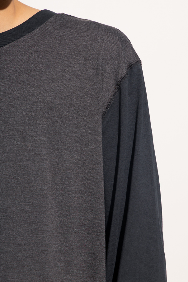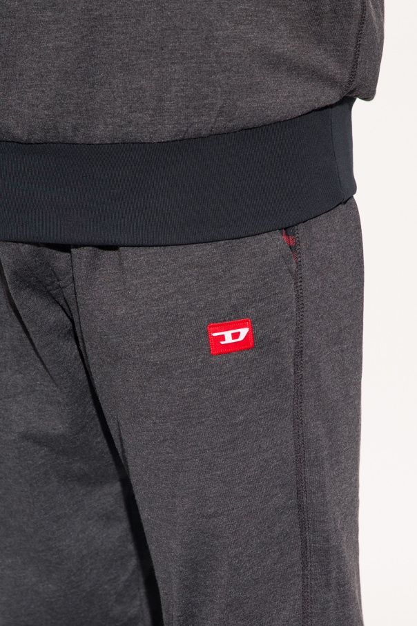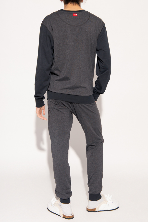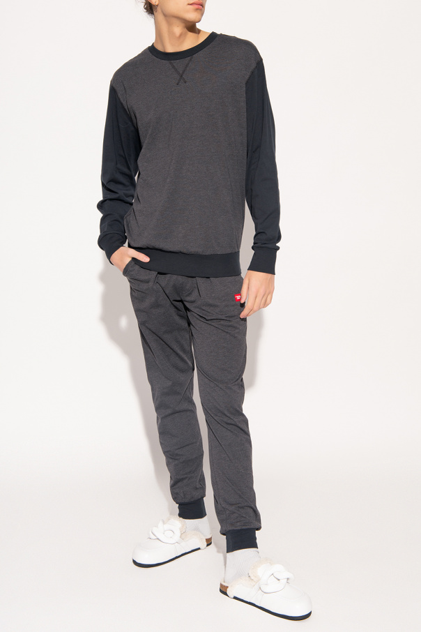 Dark grey and black two-piece pyjama set from Diesel. Made of a cotton blend, it includes a crewneck top with elasticized edges and bottoms with an elastic waist, a logo patch, colourful inserts, two side seam pockets and tapered legs with elasticated cuffs.