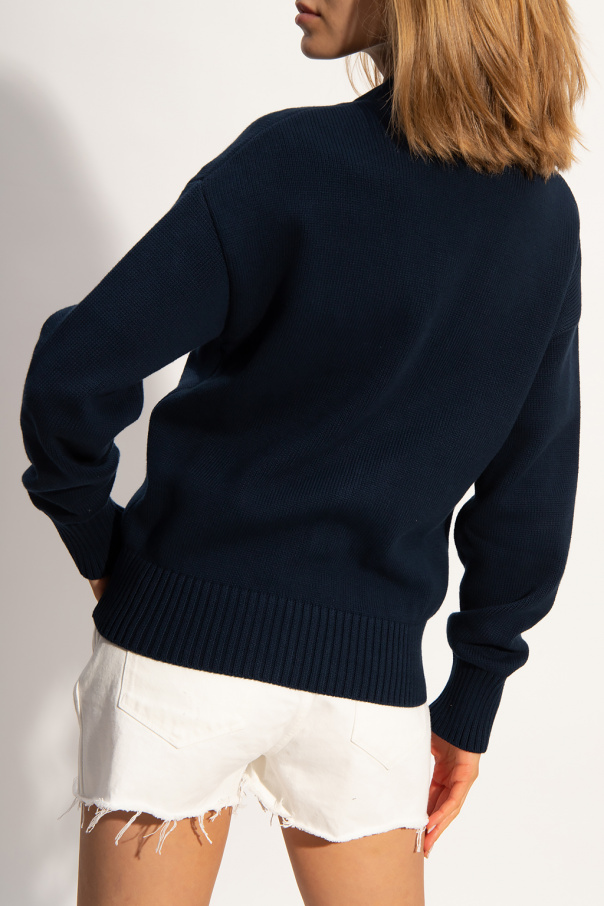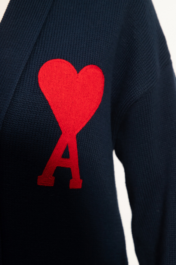 Navy V-neck cardigan from Ami Alexandre Mattiussi. Fastened with buttons, this long-sleeve design is decorated with a red logo embroidery.