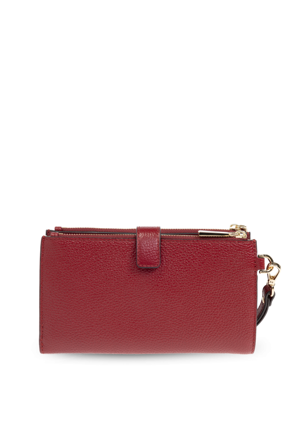 Introducing the Michael Kors Logo Wallet, a quintessential accessory from the esteemed designer Michael Kors. This exclusive wallet epitomizes sophistication and functionality, making it an indispensable addition to any elegant wardrobe. Crafted from luxurious, textured red leather, this rectangular wallet boasts a striking visual appeal. The front is adorned with the iconic gold \"MICHAEL KORS\" logo, a hallmark of the brand\'s prestigious identity. The wallet\'s interior is ingeniously organized with multiple card slots, a transparent ID window, and additional compartments for documents or cash. It features gold-tone zippers for secure closure, ensuring your essentials are kept safe. The detachable red leather wrist strap provides versatile carrying options, allowing it to be worn comfortably on the wrist. The back of the wallet includes an extra clasp, further safeguarding its contents. Designed to blend elegance with practicality, this wallet is perfect for the discerning woman who values both style and utility. Why Buy This Product? Renowned Michael Kors design Luxurious textured red leather Iconic gold logo for added prestige Multiple card slots and compartments Secure gold-tone zippers Detachable wrist strap for convenience