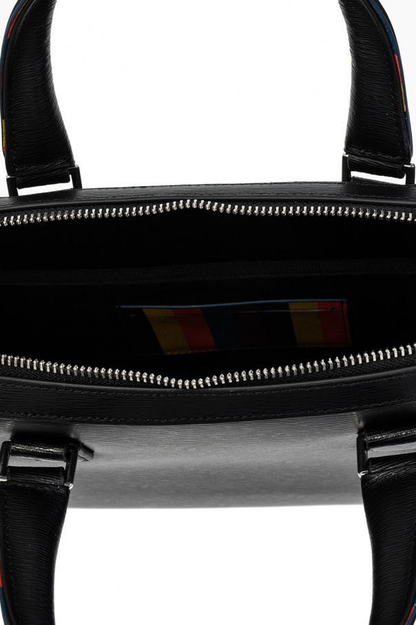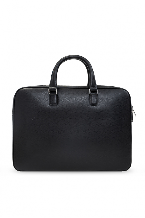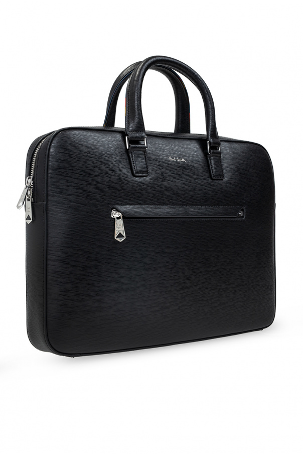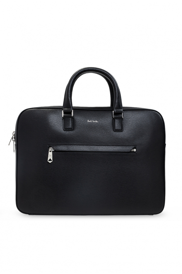 Black briefcase from Paul Smith. Crafted from cow leather and calf leather with a texture throughout, this design fastens via a two-way zip and showcases a zip pocket and an embossed silver-tone logo on the front, two half-round handles, a detachable and adjustable shoulder strap, silver-tone metal hardware and a black-clad interior with one compartment, a laptop sleeve, two slip pockets and one zip pocket.