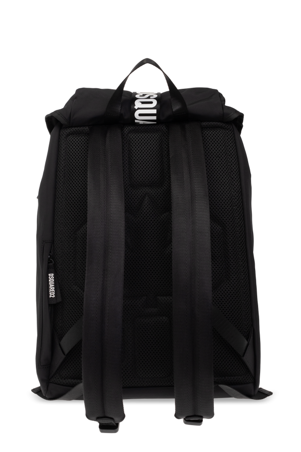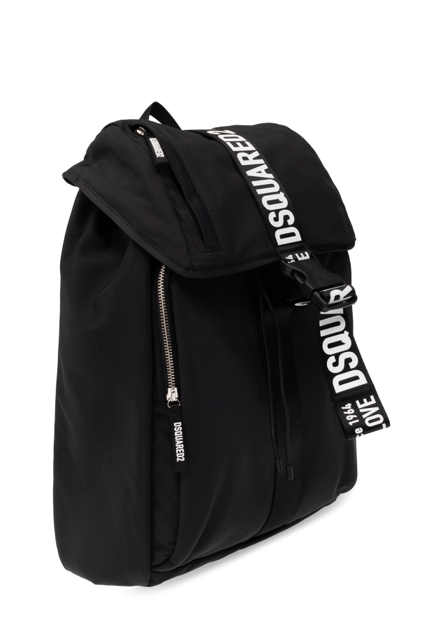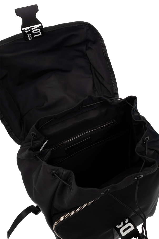 Black backpack from Dsquared2. Fastened with a buckle strap, white logo pattern, zipped front pocket, silver-tone metal hardware and one internal compartment with drawstrings and one zip pocket.