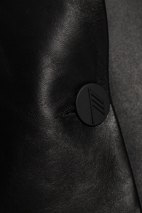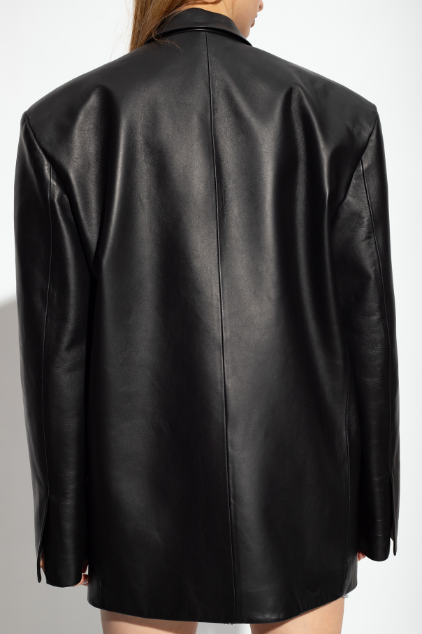 Black single-breasted blazer from The Attico. Crafted from lamb leather with an oversize fit, this style fastens with a branded button and features a collar with peak lapels, decorative stitching details on the front, one welt pocket, two flapped pockets, padded shoulders and long sleeves with slits.
