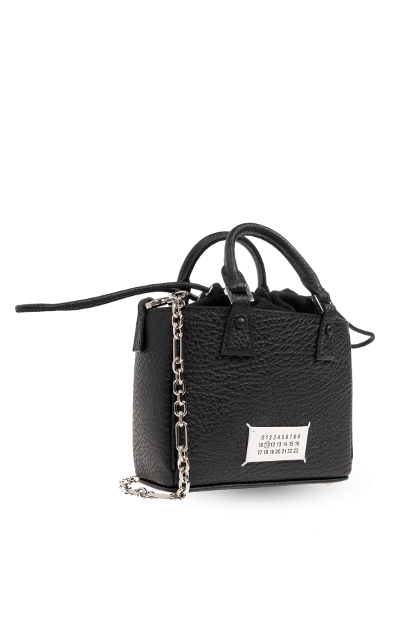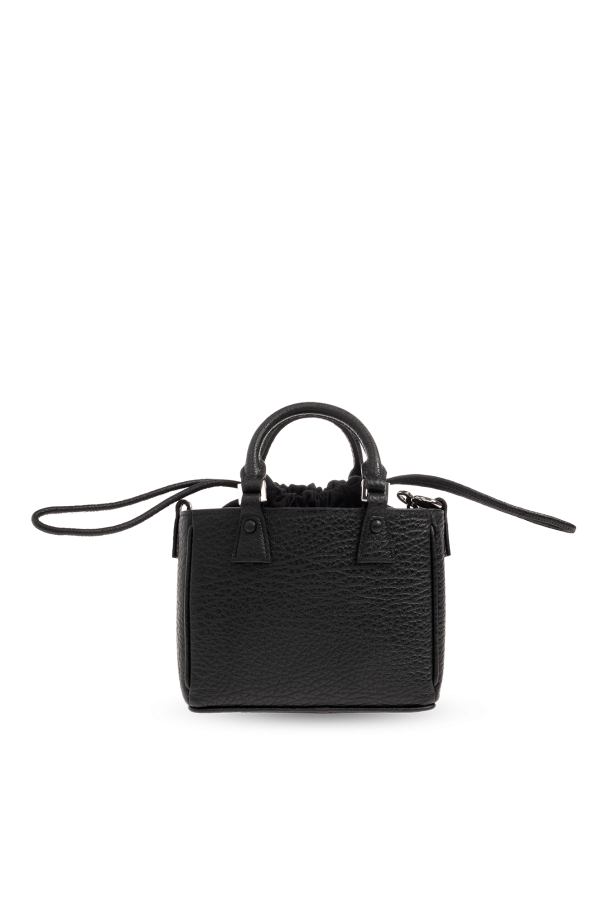 Black ‘5AC’ shoulder bag from Maison Margiela. Made of grained calf leather and trimmed with cotton, this design cinches closed with drawstrings and showcases a white logo patch, two half-round handles as well as a detachable, chain-reinforced shoulder strap, silver-tone metal hardware and one internal compartment with a zip pocket.
