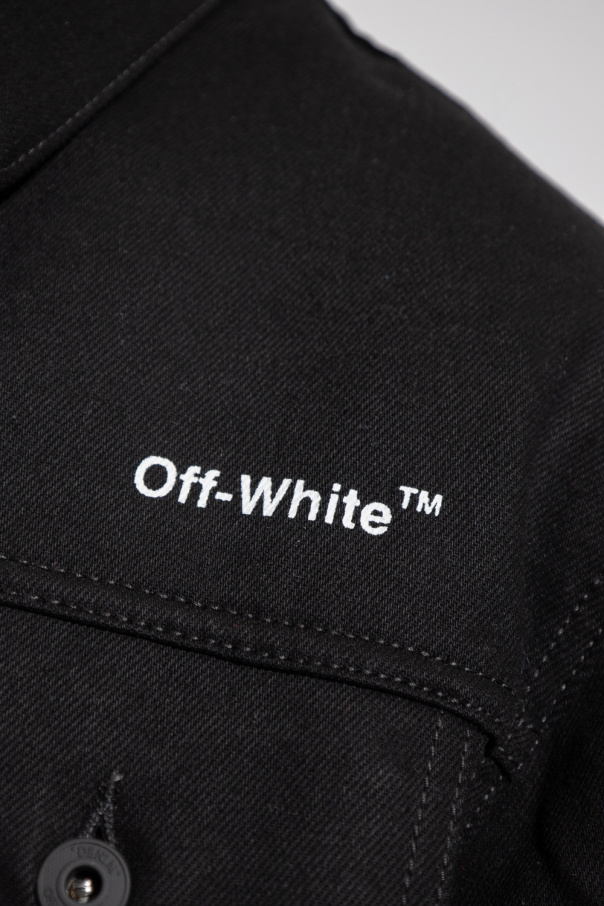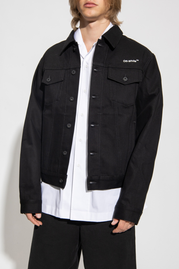 Black denim jacket from Off-White. Fastened with buttons, this garment features a logo print, the brand\'s signature diagonal stripe pattern in white at the back, two slip pockets, two buttoned flap pockets and long sleeves with buttoned cuffs.