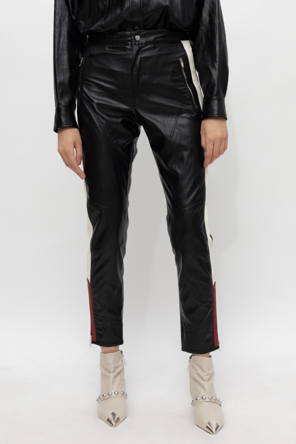 Black ‘Castille’ trousers from Isabel Marant. Crafted from faux leather, this pair falls with slightly tapered legs and features a zip fly with a snap, three zip pockets, white and red side panels and zip cuffs.
