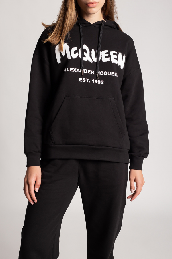 Black hoodie from Alexander McQueen. Made of cotton, this garment features a drawstring hood, white logo print, slip pocket and ribbed trims at the hem and cuffs.
