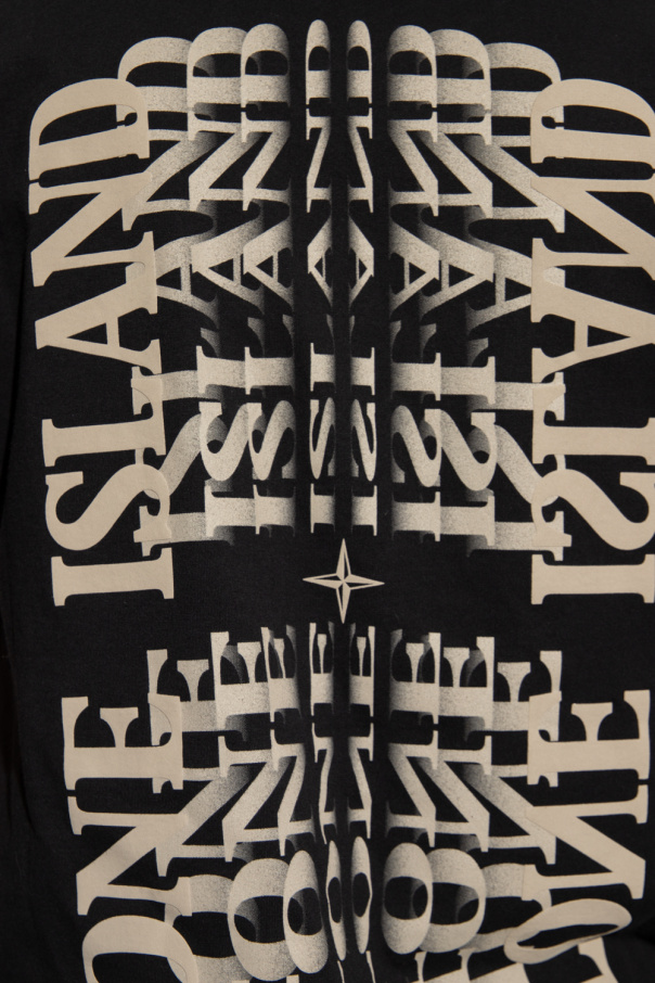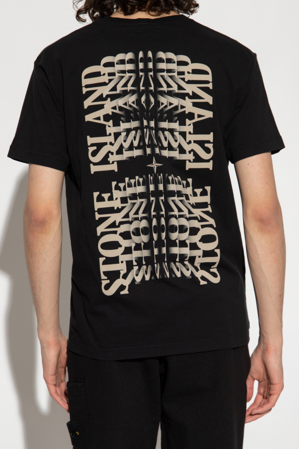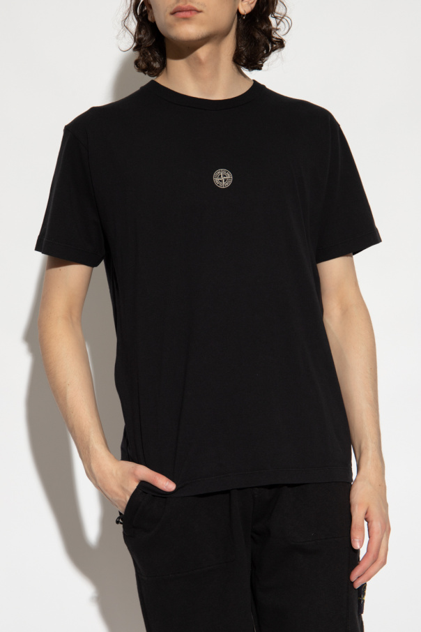 Black crewneck T-shirt from Stone Island. Made of cotton, this style features a beige logo print for brand recognition and short sleeves.