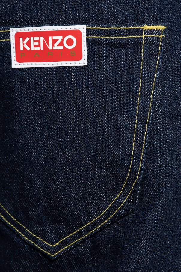 Navy jeans from Kenzo. Fastened with a button and zip, this straight leg pair features a multicolored logo patch at the back and five slip pockets.