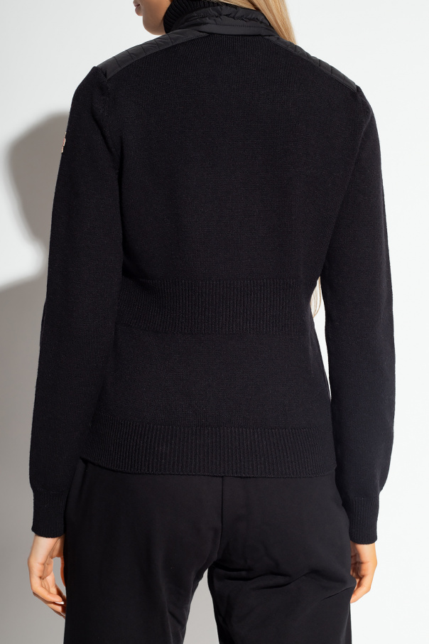 Black cardigan with a collar from Moncler Grenoble, the ‘Moncler Grenoble Apres Ski’ collection. Featuring a quilted down front panel, this style is complete with a two-way zipper and snaps, and long sleeves – one has a colourful logo patch.