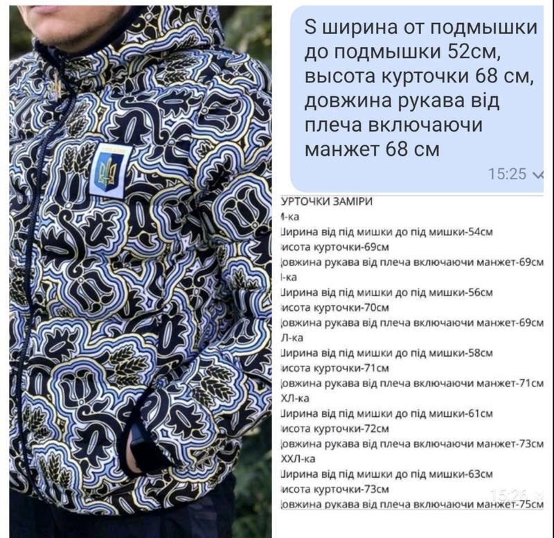 Оригінал Зима КУРТКА Колекція: UKRAINEСезон: ОСІНЬ-ЗИМА Для кого: УНИСЕКСЦ вет: КОЛЬОРОВИЙ ПАТЕРНСОСТАВ: 100% полиэстервнутри - пух ЗАМІРИ КУРТОЧКИ S-ка Ширина від під ведмедики до під ведмедики-51см Висота курточки-64см Довжина рукава від плеча включаючи манжет-66см М-ка Ширина від під ведмедики до під ведмедики-54см Висота курточки-69см Довжина рукава від плеча включаючи манжет-69см Л-ка Ширина від під ведмедики до під ведмедики-56см Висота курточки-70см Довжина рукава від плеча включаючи манжет-69см ХЛ-ка Ширина від під ведмедики до під ведмедики-58см Висота курточки-71см Довжина рукава від плеча включаючи манжет-71см ХХЛ-ка Ширина від під ведмедики до під ведмедики-61см Висота курточки-72см Довжина рукава від плеча включаючи манжет-73см ХХХЛ-ка Ширина від під ведмедики до під ведмедики-63див Висота курточки-73см Довжина рукава від плеча включаючи манжет-75см Зроблена з міцної плащової тканини, яка стійка до поривів вітру; ▪️Спеціальна мембрана надає їй водонепроникність, простібана, тепла, зимова, всередині еко-пух ( штучний пух), від плюс 5 градусів якщо носити футболку до мінус 20 якщо носити на толстовку, олимпийку, кельмі, анорак. ▪️Логотип - вишивка; ▪️Нижні кишені для рук; ✔️ПІБ ✔️№ телефону ✔️Місто ✔️№ відділення НП ✔️Розмір ( або ваш вагу і зріст і я вам підберу ) ✔️Форму оплати (💯% передплата на 💳 Приват Банку, або післяплата - по передоплаті 150 грн ‼️) ⚠️Замовлення формується на відправку, після оплати / передоплати