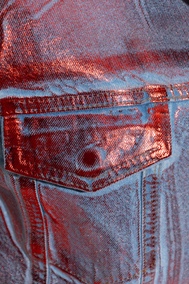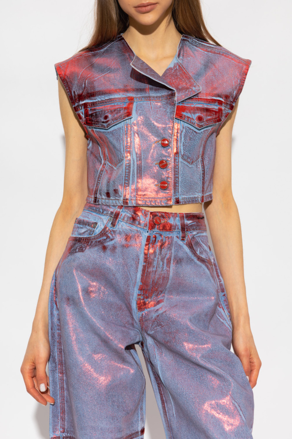 Light blue vest from Ganni. Crafted from denim with a glossy red foil, this style fastens with branded buttons and features two flapped pockets with snaps.